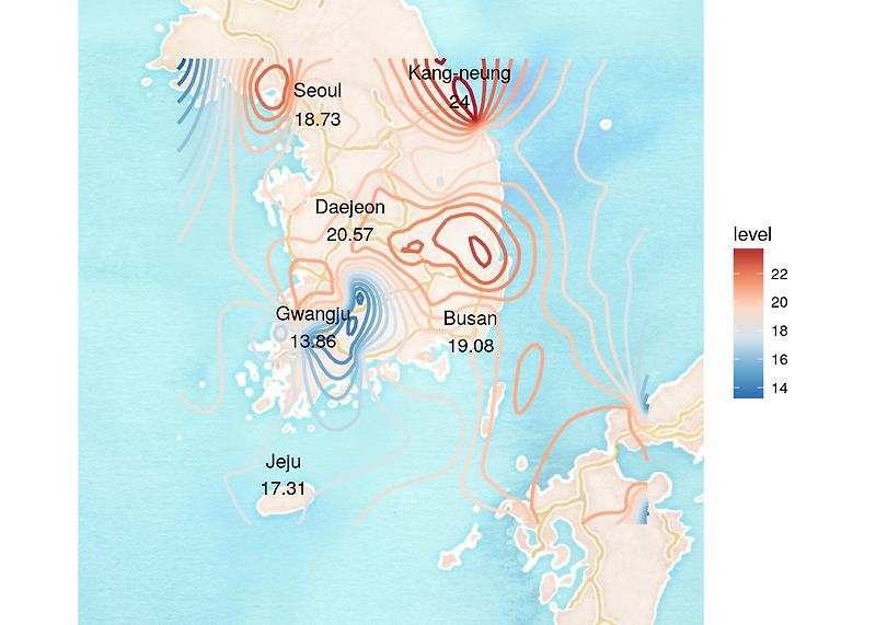 R을 이용한 시각화 2 Ggmap을 이용한 도시별 기온 지도 그리기