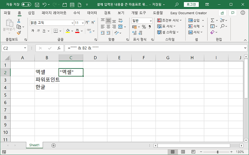 엑셀 팁 셀에 입력된 내용을 큰 따옴표로 묶는 방법 짤막한 강좌