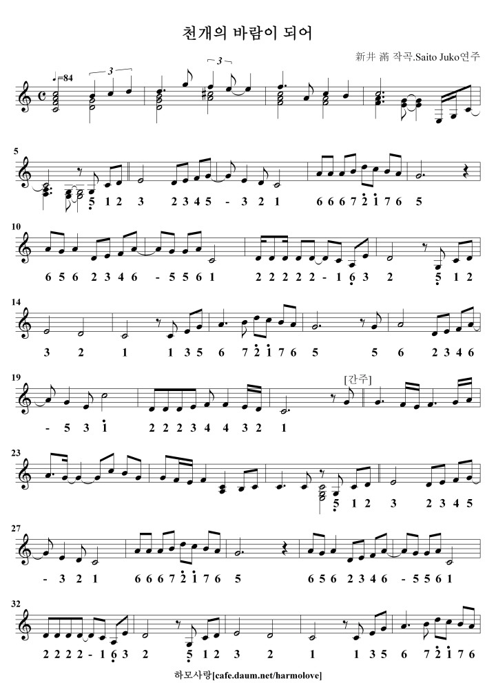 음악 리코더악보 천개의 바람이 되어 임형주 노래 아라이만 작곡 작곡 음악 악보