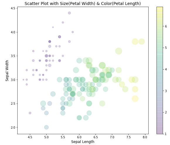 Python 4개 변수로 점의 크기와 색깔을 다르게 산점도 그리기 Scatter Plot With 4 Variables Different Size Color 3 4