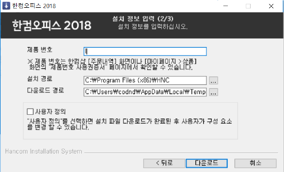 한컴오피스 2018 제품번호가 맞지 않습니다